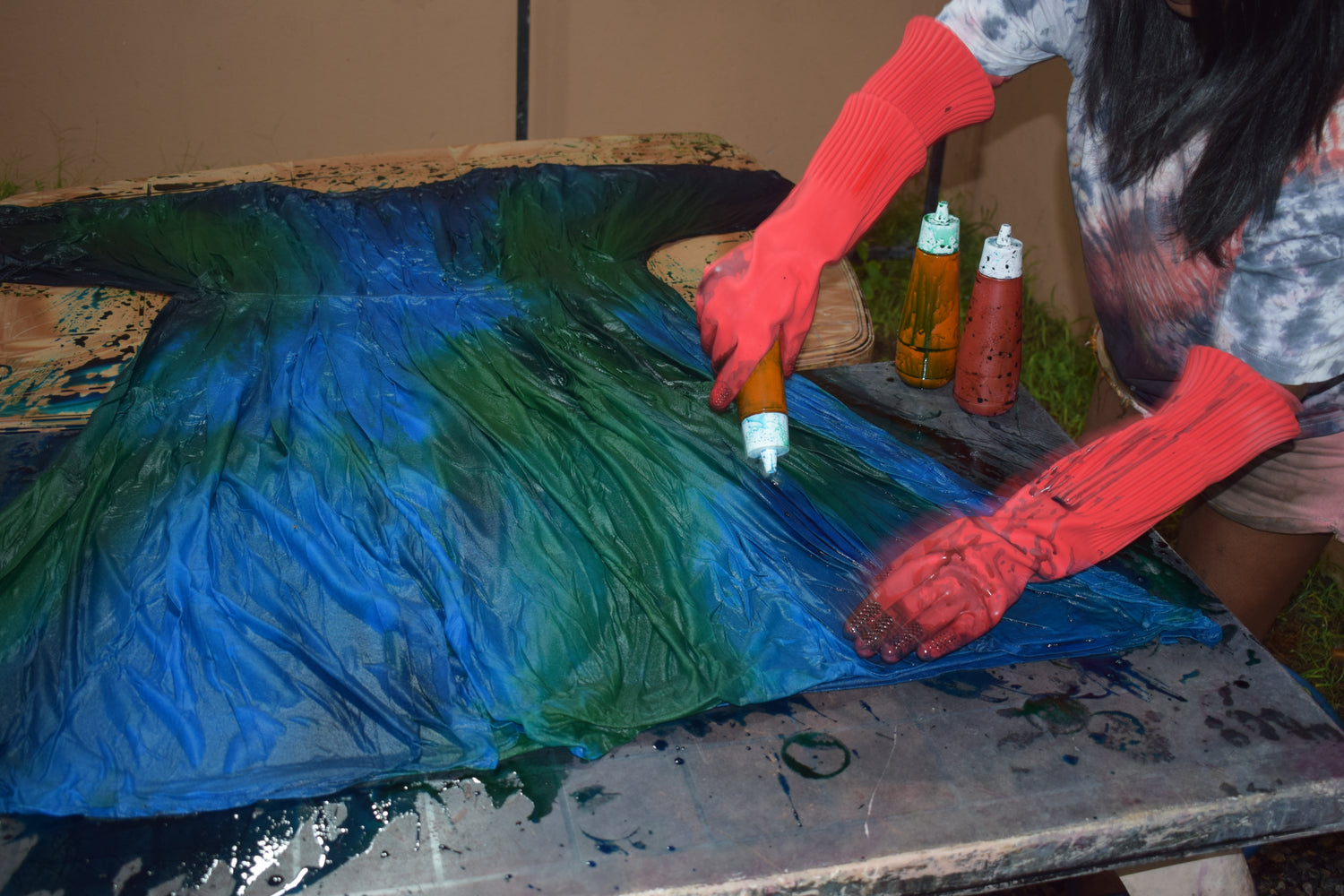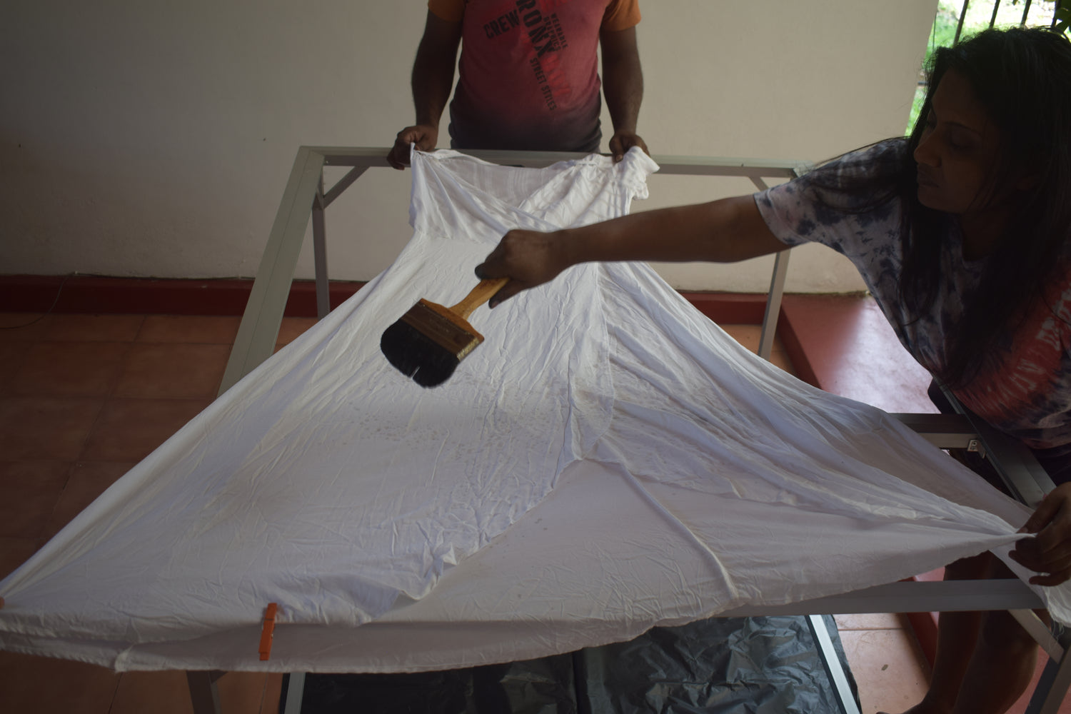 Wax is applied on the dress using different tools such as different sizes of brushes, funnel tool etc. Each tool helps to create different kinds of wax strokes and lines.